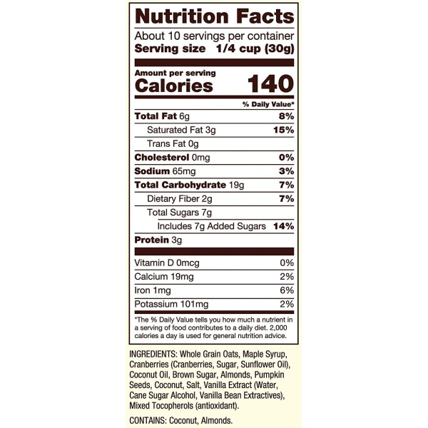 - CRANBERRY ALMOND: Whole grain oats, real maple syrup, cranberries, almonds and coconut create granola that is rich in flavor (but not too sweet)